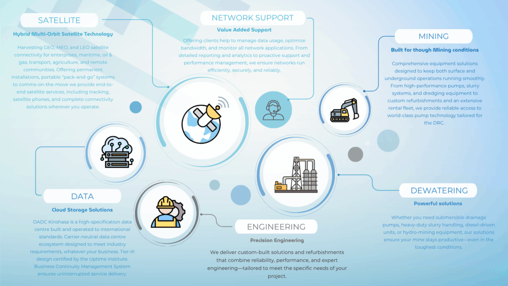 Data Centre Solutions: In collaboration with OADC, we offer secure, scalable colocation and storage services, helping businesses across the DRC grow their digital infrastructure.